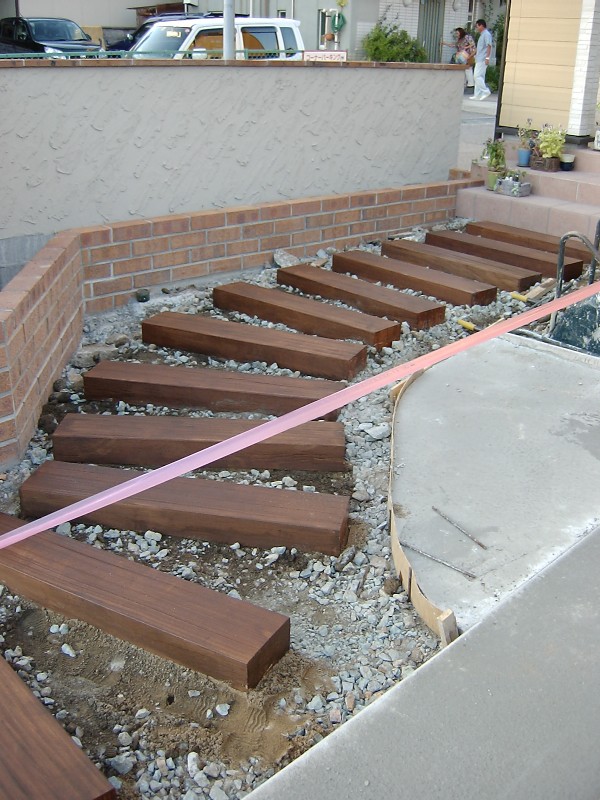 本日は踏み石が入り、花壇の中に赤土が入れられました。