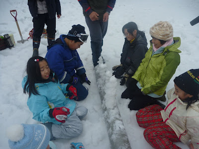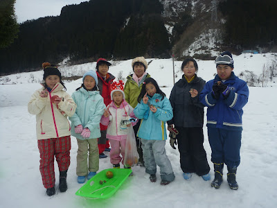 雪中のリンゴ探しはみんな真剣。3個もゲットした女の子、うれしさで笑顔が耐えなかった。休み時、みんなでリンゴをかじる。