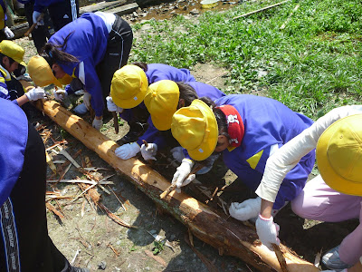 今日の体験は、間伐材を山から引き出しし、広場で杉の皮剥ぎをした後、ダムづくりとして三方水路の柿の木谷水路底に2本設置することでした。