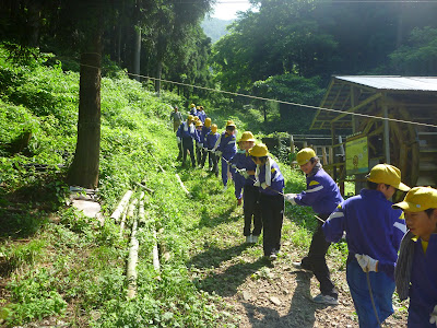 特に、谷間を空中で結ぶ支間40mの「渡し」が大人気。最初、児童等に安全ベルトの装着方法、滑車に自身をつり下げる操作及び危険回避方策、補助ロ-プを引いての自走方法などを、丁寧に教える。児童等は1回体験して自信を得たのか、以降、帰るまで「渡し」を楽しんでいた。