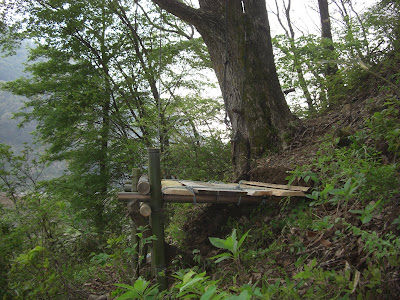 従前の台を全部壊し、新たに竹と杉板で長さ2,2m、奥行き75cmのスタ−ト台を夕方までに完成する。これで今年度の木登りメニュ−の準備完了。ドンドンのぼらせるぞ−!!15mの頂きから見る朝日岳や小川、夢創塾広場を見ることで目線が違ってくることを体験してもらう。