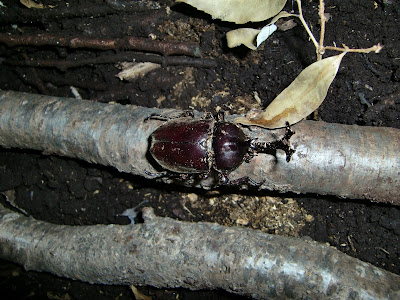 私が富山で講演中に、入善の上島君がカブトムシを養育箱に入れ、幼虫が成育できるようにセットしていった模様。蓋を開けてみるとオスのカブトムシが1匹、木の枝につながっていた。